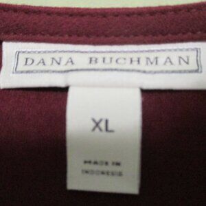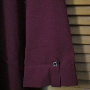 Dana Buchman brand - Pretty cranberry colored top. 3/4 length sleeves that have a decorative button at the cuff. The front has tiered material and the back is a stretchy soft knit material. Like new condition.