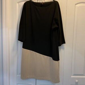 Very comfortable 2 tone dress with three quarter sleeves. Original owner, only worn twice. 75% polyester, 23% rayon, 3% spandex. Has a little stretch to it. Machine wash.