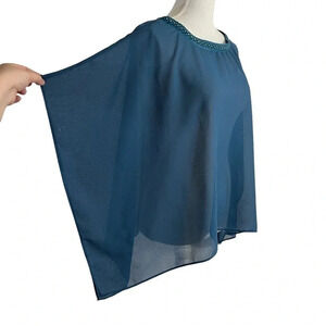 Plus size 16W, blouse, top, shirt, over shirt, blue, round neckline, flared sleeves, short sleeve, polyester, solid pattern, plain, beaded, beads embellished, unlined, collarless, sheer, lightweight, casual, workwear, office, party, cocktail, evening, formal, pullover, spring, summer, made in vietnam, hand wash