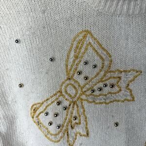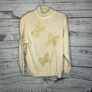 Dana Scott vintage sweater, beaded bow sweater, silk angora blend, mock neck sweater, embroidered vintage knit, holiday party sweater, 80s 90s glam sweater, cream gold bow design