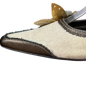 The product is a pair of Dana Stein women's leather slip-on kitten heels mules with pointed toe shoes in size 37 (6.5). These shoes are perfect for various occasions like weddings, parties, or business events. The low heel height and comfortable foam insole make them suitable for all-day wear. The beige color and solid pattern add a touch of sophistication to the stylish mule design. Made in Italy with high-quality leather, these shoes are lined and feature a cone heel style for added elegance.