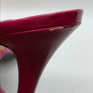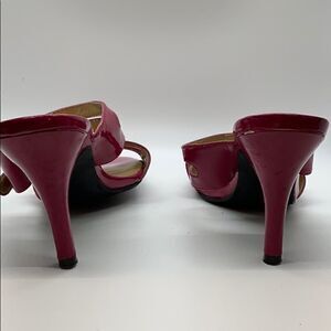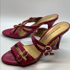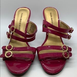 Dana Bachman pink straps slip on heels in hot magenta. Gold buckle accents. 4” heel. All man made materials. Strapped stilettos.