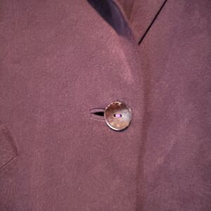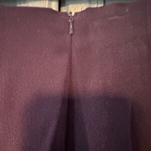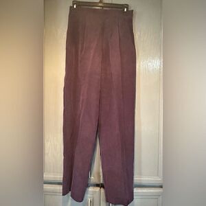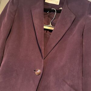 Beautiful suit! 100% silk. Purple, size 4. The material is so soft! Pants zipper down the back and have two side pockets. Jacket is lined and has two side pockets and has a button close.