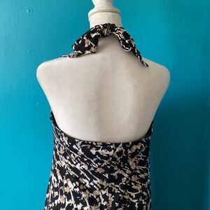 Dana Buchman maxi dress. Halter style. Ties behind the neck. Black, tan and white pattern. 96% polyester 4% spandex. Great condition