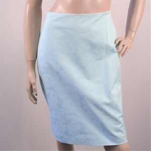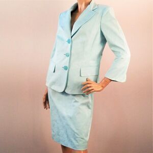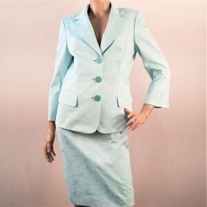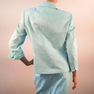 Dana Buchman Oasis Blue . Paisley Textured Fabric . Gorgeous Buttons Detail . Flat Front Skirt With Back Vent And Size Zipper Closure . Lined . Tailored Matching Blazer . 3 Button Closer . Flap Pockets . 3/4 Sleeve . Lined Tagged Women's Size 10 . NEW Tags $700 .