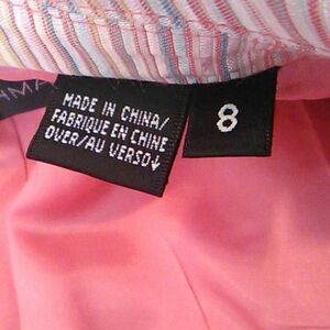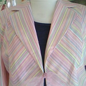 Like new. Such a beauty! Beautiful woven fabric with stripes of lovely pastel colors. Vibrant pink lining. Fabric is fashioned into chevron stripes that are perfectly matched. Pockets. Slightly padded shoulders. One hook to close front with sheer ribbon to tie. Ribbons at vented cuff. Size 8 measures 40 at chest, 42 at bottom, 25 long from shoulder to hem. Sleeves 25 long. Pretty over all your spring pieces!