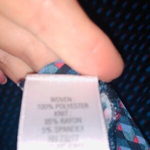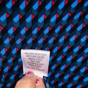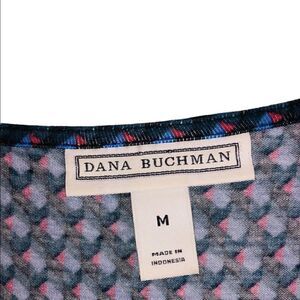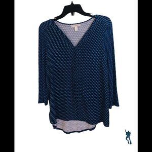 Light and flowing is this Dana Buchman blue and red ticking. Three quarter sleeves. V-neck and very cozy and soft. 100% polyester. Machine wash air dry.