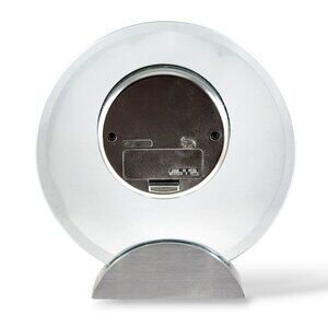 WORKING Danbury Clock Company quartz desk clock, round glass modernist style with brushed metal ISKANDAR base.