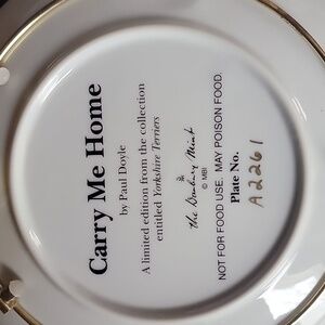 Danbury Mint Carry Me Home is a limited edition from the collection entitled Yorkshire Terriers. The picture on the plate couldn't be more adorable then seeing a Yorkie poking out from a basket. The plate is preowned and in excellent condition. It is approximately 8 inches in diameter and comes with the metal plate frame.