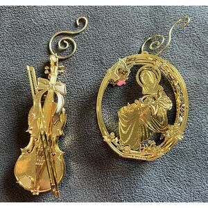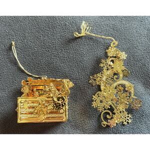 lAdd a touch of elegance to your holiday decor with this set of 12 Danbury Mint gold ornaments. Each ornament is carefully crafted to ensure exquisite detail and quality. This collection is perfect for collectors or those looking to add some sparkle to their holiday tree. The ornaments are preowned but have been well-maintained and are in excellent condition. Celebrate the holidays in style with this beautiful set of Danbury Mint ornaments. This set includes 1. Violin 2. Santa's Express Train 1993 3.2008 Yuletide Carriage 4. A Savior is Born 2003 5. 1998 Swirling Snowflakes 6. 1999 Toy Chest 7. 2000 Teddy Bear Surprise 8. 1994 Cherub Harp 9. 2006 Cuckoo Clock 10. 2005 Hope 11. 2008 Holiday Lighthouse 12. 2012 First Day of Christmas. Please refer to photos as I have done my best to describe but I am not an expert in Danbury Mint. These ornaments come in the Danbury Mint box with divided slots for the 12 ornaments. Please message me with any questions or concerns. M-159