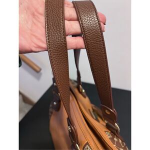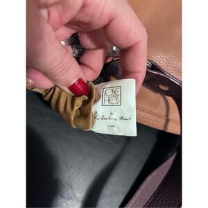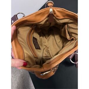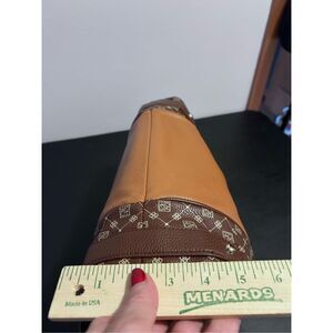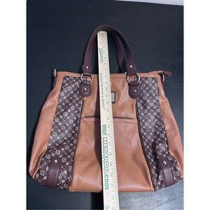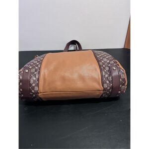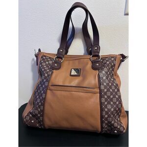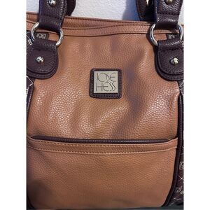 This designer leather shoulder bag features a two-tone brown exterior with the iconic Jose Hess logo.