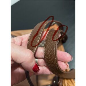 This does NOT have shoulder bag strap and slight wear marks & few loose strings on handle strap / see 4th pic and other pics for approx measurements