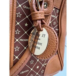 This limited edition shoulder bag from Danbury Mint is a must-have for any President Obama admirer. Featuring the iconic "Hope, Progress, Change" design, this bag captures the spirit of the historic campaign. The brown faux leather exterior is both durable and stylish, complemented by gold hardware, adjustable strap, pockets inside and a gold zip closure. Spacious interior offers plenty of room for your essentials.