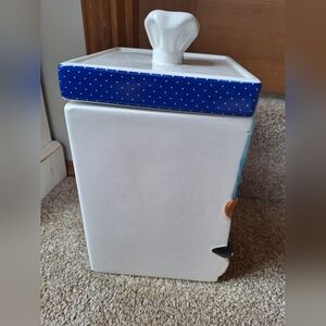 Danbury Mint Collectible Pillsbury Doughboy Ceramic Canister. Largest of the set. Completed set makes a cooking scene. There are a few small chips throughout the front, as shown in last couple pics. 6x6.5x9.5" measurements are approximate