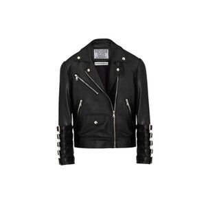 Description from retailer: Black lambskin jacket. Three side pockets with zippers. Decorated with a button flap. Five buckle straps on sleeves. Regular fit.