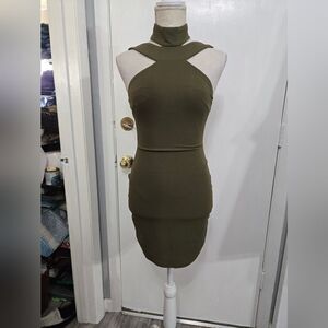 The dress pictured is an olive green bodycon dress from the brand Dance & Marvel. It features a halter neckline, crisscross straps at the front, and a cutout back.