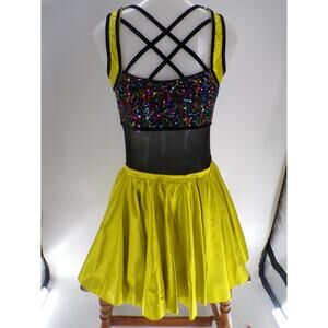 Brand: Revolution RC18586 Size: Adult Large Adult Colors: Green Black Red Blue Pink Great For: Jazz Tap Clogging Musical Theater Features: Tank Sequin Leotard with mesh mid drift. Attached skirt with velvet trimming and sequined bodice. Flower headpiece included.
