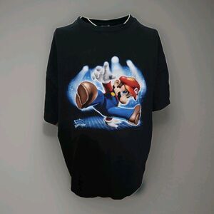 This vintage Dance Dance Revolution Mario Mix 2008 video game shirt in size XXL features a crew neck and short sleeves, perfect for the summer, fall, and spring seasons. The black cotton shirt showcases a logo and graphic print of Mario, with accents that reflect the theme of USA, music, video games, and dancing from the 90s era. This rare Nintendo-branded shirt is lightweight and easy to care for, making it a unique and nostalgic piece for any fan of the Super Mario franchise.