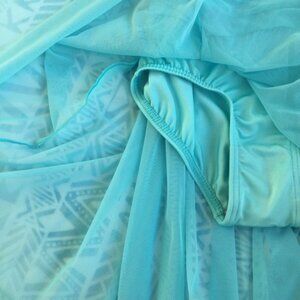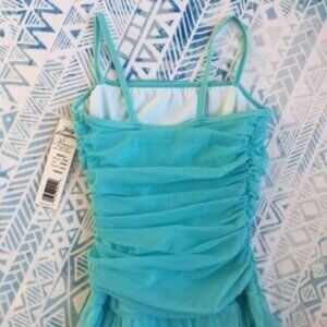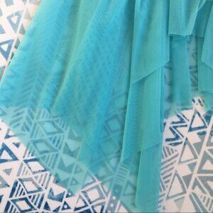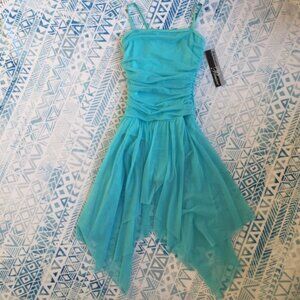 Turquoise Body Wrappers dance dress with attached leotard. Beautiful handkerchief hem skirt and ruched top. Light sheer mesh fabric. Leotard is lined in front.