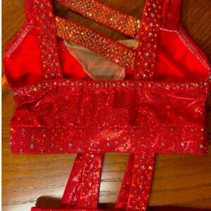 Custom-designed, one-of-a-kind, red biketard base with strappy asymmetrical cut-outs, dazzling premium stoned, phoenix fire sparkling bling, attention-grabbing. My 9–10-year-old daughter was the judge's favorite, performing her solo "ATTENTION" and commanding the stage in this fierce, sassy jazz acro costume!