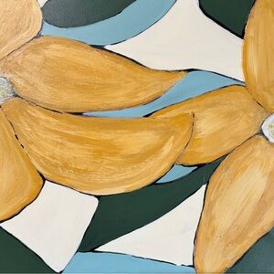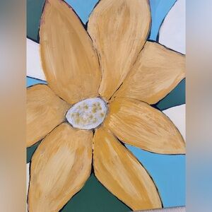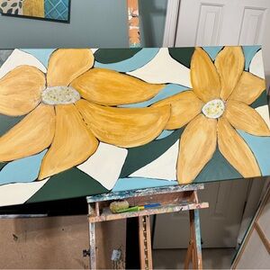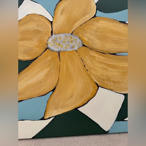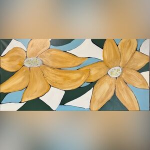 Enhance your space with this stunning abstract floral painting. Featuring vibrant gold petals with glittering flower centers against a rich background, this piece adds a touch of elegance to any room.