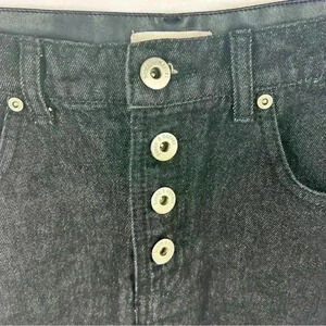 Keywords: Dance & Marvel, mini skirt, black denim, distressed, ripped, frayed hem, casual skirt, women's fashion, spring skirt, summer skirt, fall skirt, pre-owned skirt, button closure, pockets, raw hem.