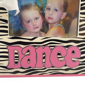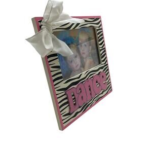 Dance Picture Frame Little Girl’s Gymnastics Zebra Stripe Pink Lettering. Adorable frame to celebrate your little one’s dance accomplishments. Wood frame has zebra stripe design on front and edged in pink. Dance lettering on front in pink with glitter edging. Actual frame is 10” x 10” and accommodates a 4” x 6” photo. Glass window. Has back stand for sitting on shelf or table. Topped off with a white bow with light wire at edge to fluff up bow for display. New Without Tag.