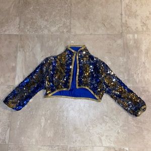 It is a blue jumpsuit with a sequined tutu. It comes with a sequined jacket and a matching hair ribbon.It has been worn once.