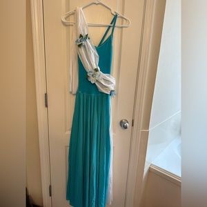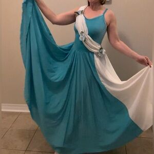 Blue and white lyrical costume. Worn once. Size adult medium but taken in about a 1/2 inch on each side to fit like a small. Could be let back out.