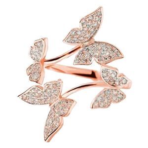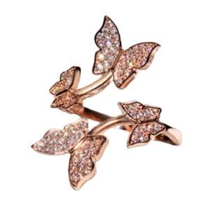 A rose gold toned ring features butterflies dancing around the band accented with clear crystals