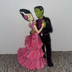 Absolutely a beautiful piece, 16" tall Frankenstein and his beautiful Bride, she is dressed in a pink dress and Frankenstein in a tux and his belt has a skull.