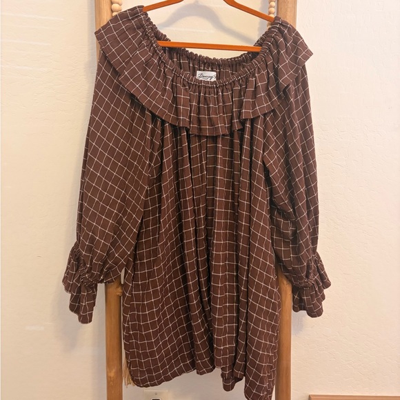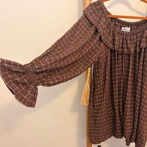 Soft brown dress with white windowpane check. Off-shoulder neckline with ruffle detail. Long puff sleeves with elastic ruffle cuffs. Lightweight, flowy silhouette. Great for casual or styled looks.