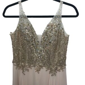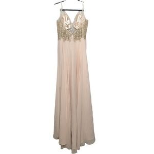 Beige (champagne) evening dress with beaded bodice, a plunging sweetheart neckline, and open back. Has a sheer inset detail at the bust supported with dainty straps Has soft pleats on the chiffon tailored A-line skirt. The back has center zipper closure and a sweep train. Preowned. Has some discoloration on the skirt. Also missing a couple of beads. Nonetheless still gorgeous.