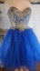 Stunning strapless dress with intricate silver embellishments on the bodice and a vibrant blue skirt.