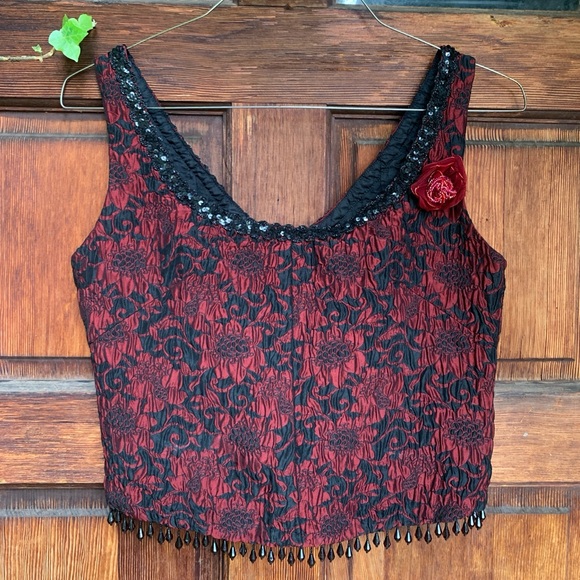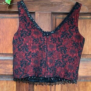 1990s red and black sequin and lace corset top with beaded flower detail
