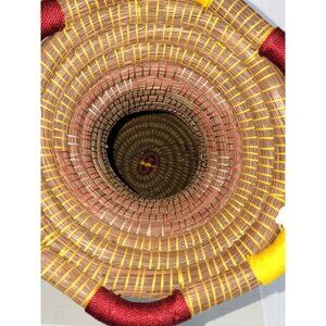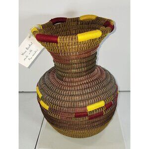 This beautifully handcrafted vase basket is made with pine needles, showcasing intricate artistry and natural elegance. Ideal for adding a touch of nature to any home decor, it is perfect for holding dried flowers or as a standalone decorative piece. The tag retail price is $200 and is 13" in height and about 9" across longest point.