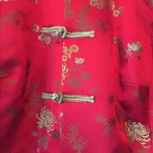 Mid waist Red embroidered Jacket with gold and brown flowers. The sleeve are long with cuffs. 78% rayon 22% silk Lining 10% Rayon