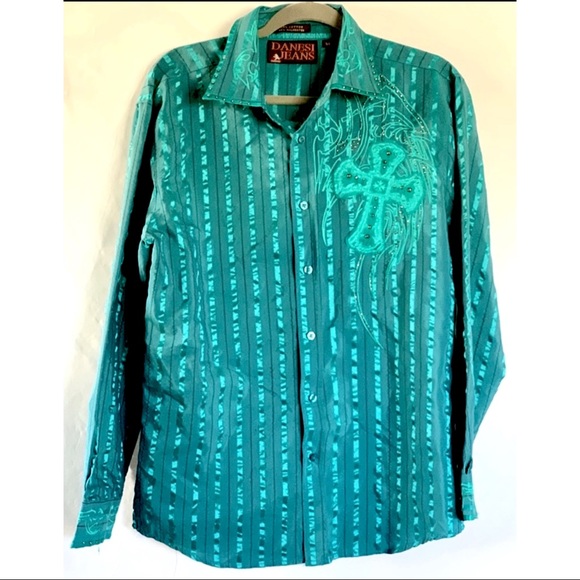 NWOT this shirt is beautiful, features gunmetal stud work along collar and on embroidered crosses on the front and back of shirt. In excellent condition