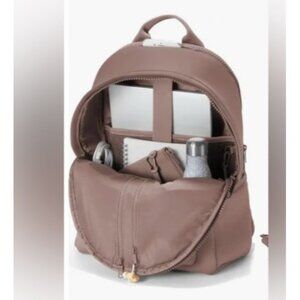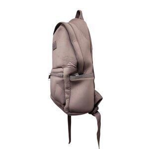 The Dange Dover Dakota Medium Neoprene Backpack is a stylish and functional backpack designed for women. Made from durable neoprene material, this solid beige backpack features a zip closure and black handles/straps for added versatility. The medium size and sleek design make it perfect for everyday use, with a cozy blue lining adding a pop of color to the overall look. The hardware color is also black, creating a clean and modern aesthetic. Perfect for those looking for a reliable and fashionable backpack to complement their wardrobe.
