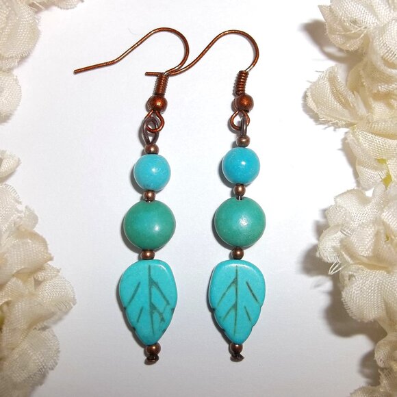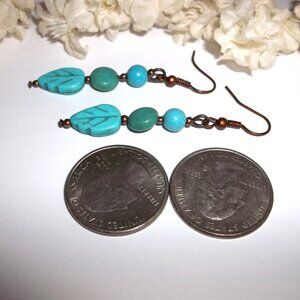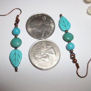 This beaded earring set is brand new and handmade by me - wvluckygirl. Handcrafted with faux turquoise blue beads and faux green turquoise beads. Bottom bead is a leaf shape. It also has antiqued copper toned beads. They dangle and drop from French fish wire ear hooks for her pierced ears. Measure 2 1/8 inches tall and 3/8 inches wide. Each single earring weighs 1.8 grams. Lightweight. The perfect fashion accessory to add a little color to your outfit. Buy it now before someone else does!