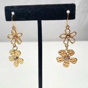 Dangle Drop Pierced Hook Earrings Gold Tone And Rhinestone Flower Tower