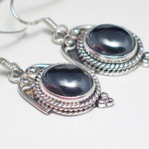 nice pair of Sterling Silver earrings. They feature an oval cut hematite stone surrounded by a halo of rope detailing and accented by bead ball orbs, These are heavy weighing in at 10.4 grams for the pair, back is flat except for a small area behind the stone, hook stud post, sorry for the lack of photos but my camera battery died during my session, overall length is 40.64 mm. width is 15 mm. This item can be found online at Blingschlingers Jewelry in the Sterling Silver Earrings Section