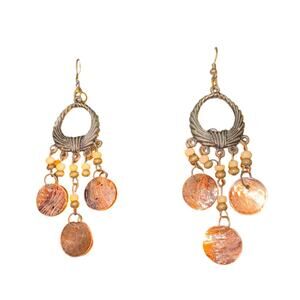 Dangle Earrings / Hoops Wooden / Brass Disk / Vintage