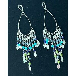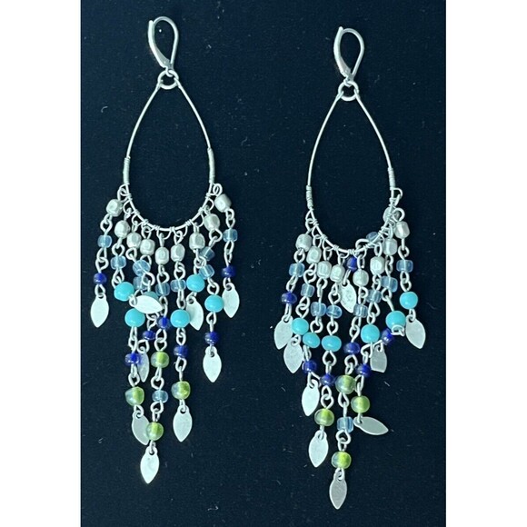 Dangle Earrings Loop Chandelier Blue Beaded Drop Silvertone Boho Hippie Festival