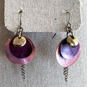 Cute dangling earrings with a small silver gray bead & two shimmery purple round discs & 2 delicate chains