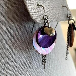 Elevate your style with these Purple Iridescent Shell and Chain Dangle Earrings. The unique round shape of the shell and the beautiful purple color of the main stone make these earrings an elegant addition to any outfit. The hook closure ensures a secure fit while the dangle/drop style adds a touch of sophistication. These earrings are a perfect choice for those who appreciate antique and vintage pieces. They are not personalized or customized, making them suitable for anyone. These earrings are not handmade or available for wholesale.