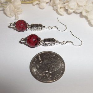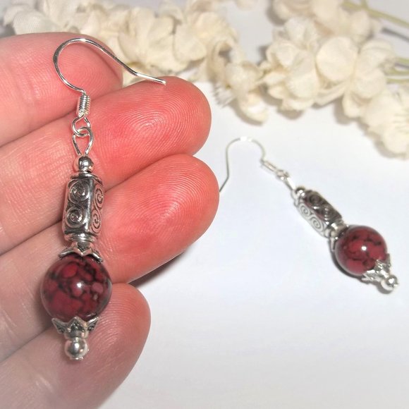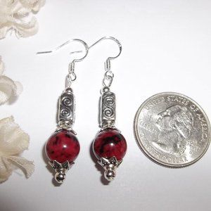 Brand new and handmade by me - wvluckygirl. These gorgeous, beaded dangle earrings are sure to get you lots of compliments. Handcrafted with dark red acrylic beads with a beautiful black marbled design. They have antiqued silver toned costume jewelry beads. The pair dangle and drop from 925 sterling silver French fish hook ear wires for her pierced ears. Nickel safe. Measure 2 inches tall & 3/8 inch wide. Each single earring weighs 2.1 grams. Lightweight! Buy them now before someone else does!