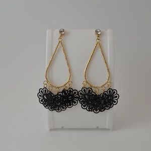 NWT Boutique Item. Dangle Gold teardrop shaped hoop earrings attached to a rhinestone post with black Flower Charms.