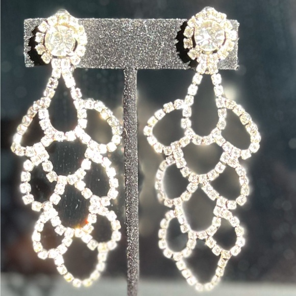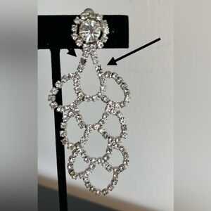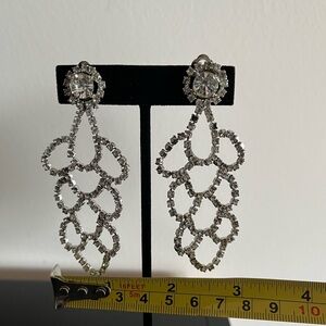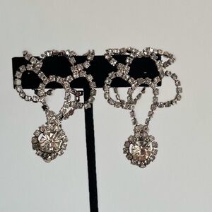Pretty dangle formal earrings. Clip on. Silver tone with rhinestones. Lightweight, open web like design, flexes with a lot of movement that picks up light. Pre-owned in good condition.*