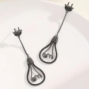 The earrings are shaped like light bulbs with the cord and plug attached. Made with darkened copper and tiny black crystals, they have a touch of sparkle! Very Fluid and Sassy!